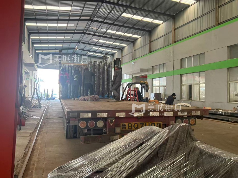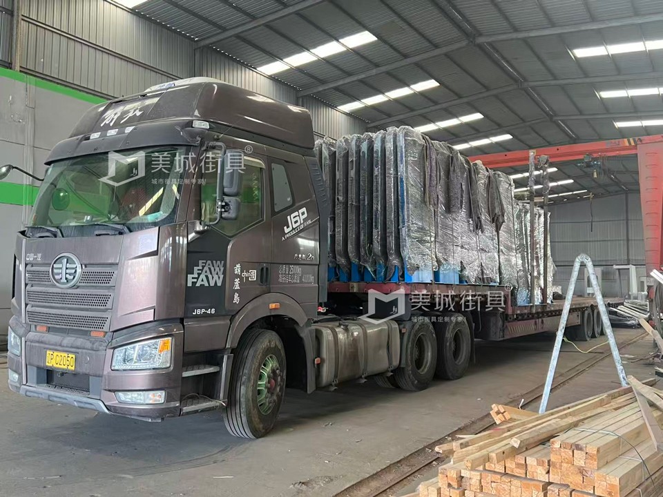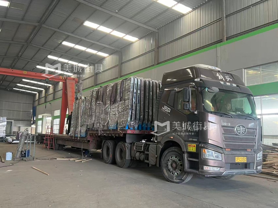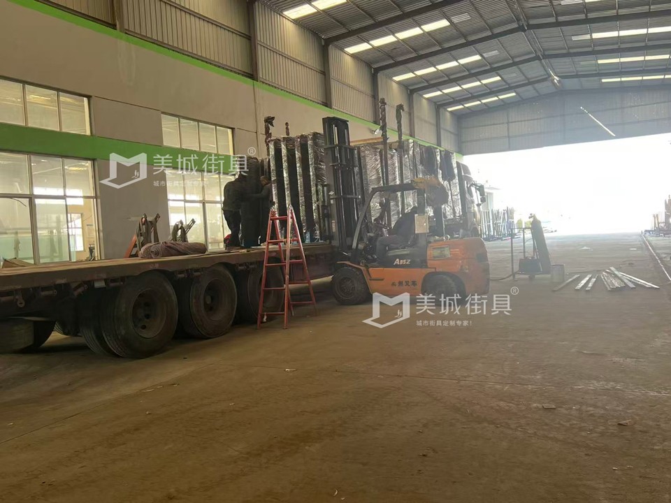 江蘇美城街具供應葫蘆島第四批公交候車亭發貨案例,以下是候車亭站臺發貨現場圖: